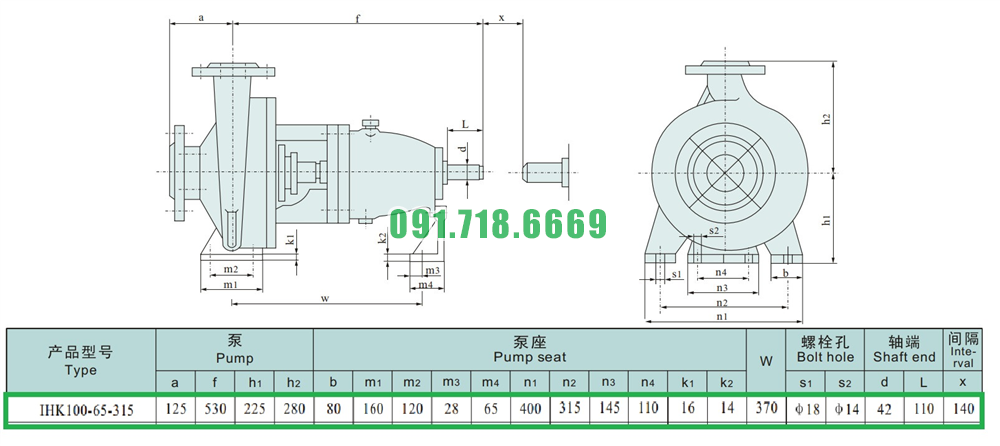 Kích thước của đầu bơm li tâm cánh hở đường thoát đầu vào ra Dn100 model IHK100-65-315