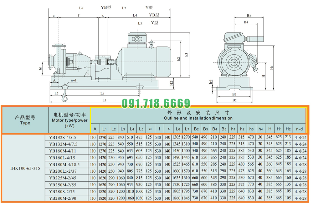 Kích thước lắp đặt của bơm li tâm cánh hở đường thoát đầu vào ra Dn100 model IHK100-65-315