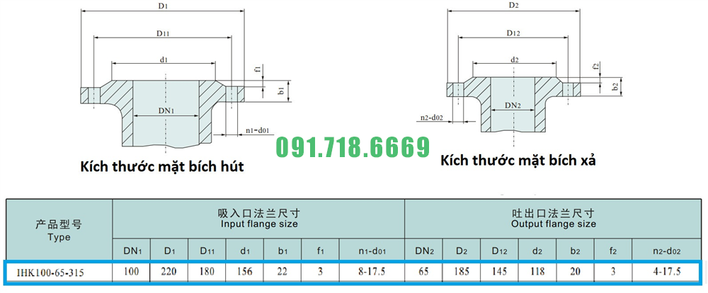 Kích thước mặt bích của bơm li tâm cánh hở đường thoát đầu vào ra Dn100 model IHK100-65-315