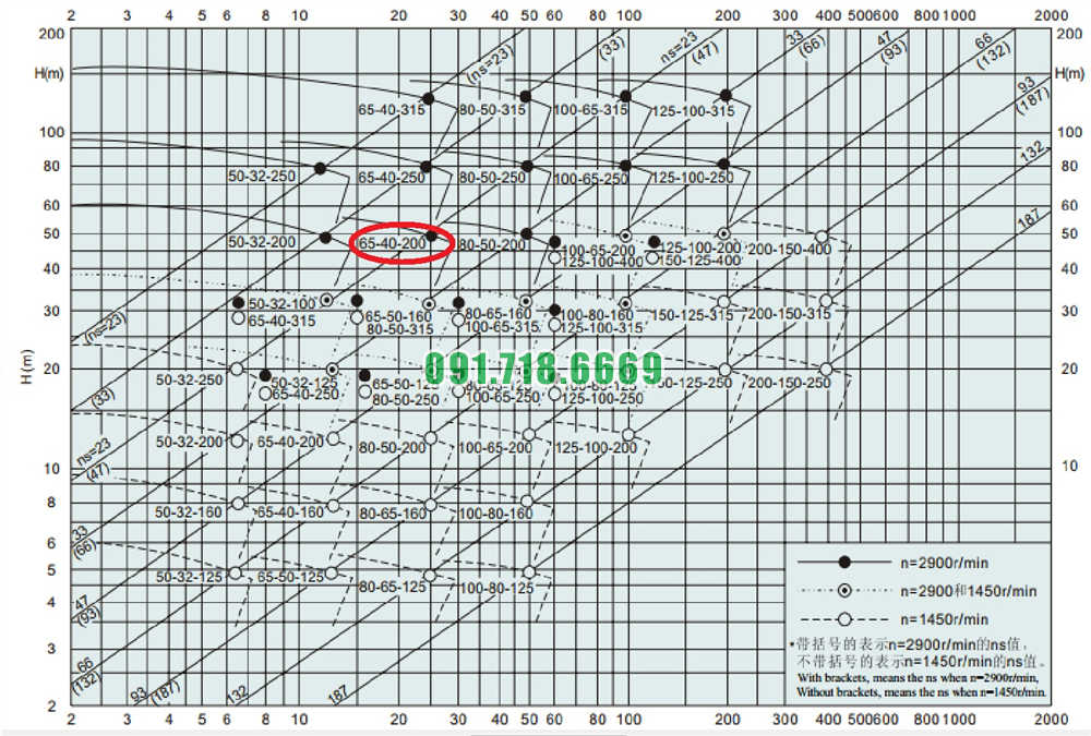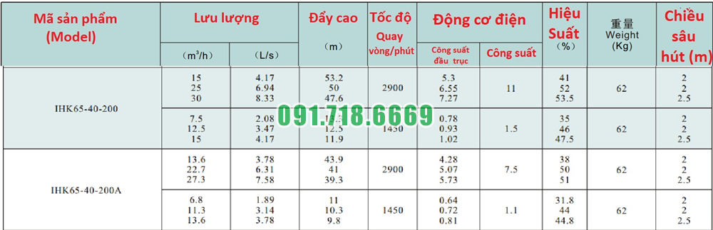 Bảng lưu lượng của bơm li tâm cánh hở model IHK65-40-200