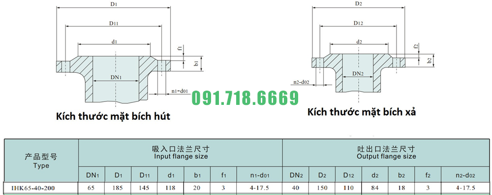 Kích thước mặt bích của bơm li tâm cánh hở model IHK65-40-200