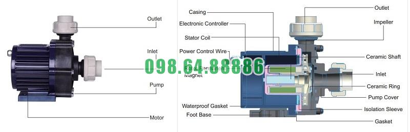 - Không có tiếp xúc cơ khí giữa trục động cơ và cánh bơm, giúp bơm hoạt động cực kỳ êm.