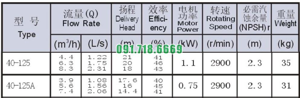 Đường cong hiệu suất bơm nước trục ngang SLW-ISW40-125 độngg cơ 1.1 kw lưu lượng 8.3 m3/h