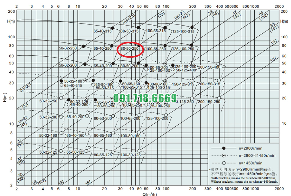 Bảng lưu lượng của máy bơm cánh hở li tâm trục ngang IHK80-50-250 lưu lượng 13-60 m3/h