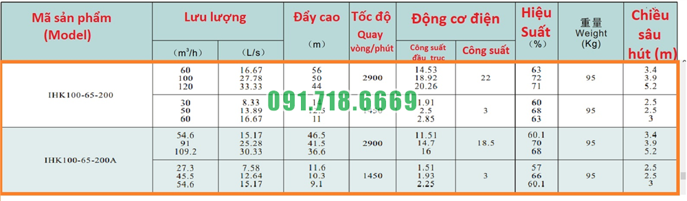 Bảng lưu lượng của máy bơm cánh hở li tâm trục ngang IHK100-65-200 vật liệu inox 316