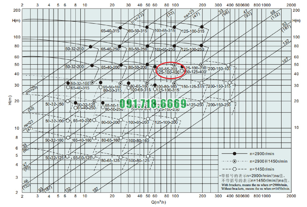 Đường cong hiệu suất của máy bơm cánh hở li tâm trục ngang IHK100-65-200 vật liệu inox 316