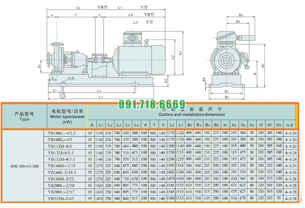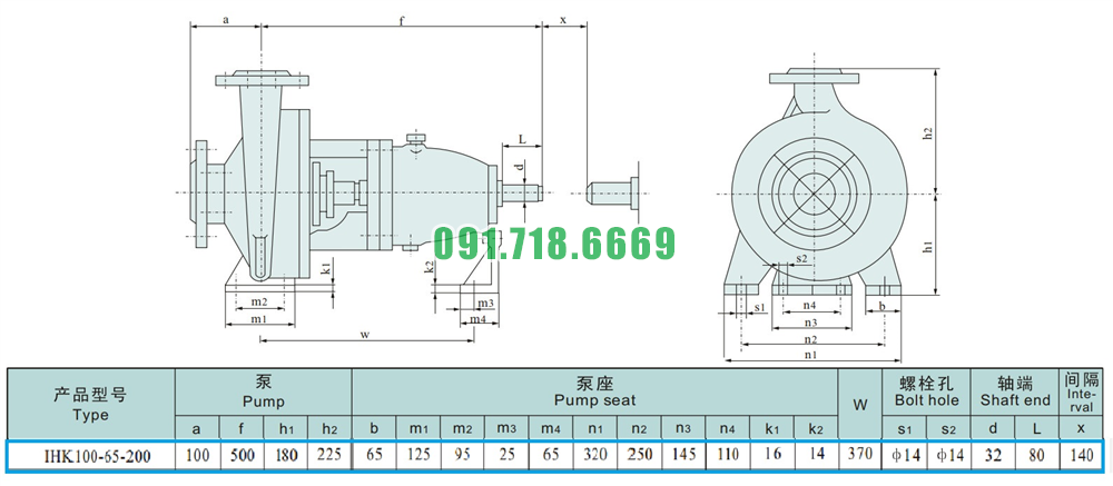 Kích thước của đầu máy bơm cánh hở li tâm trục ngang IHK100-65-200 vật liệu inox 316