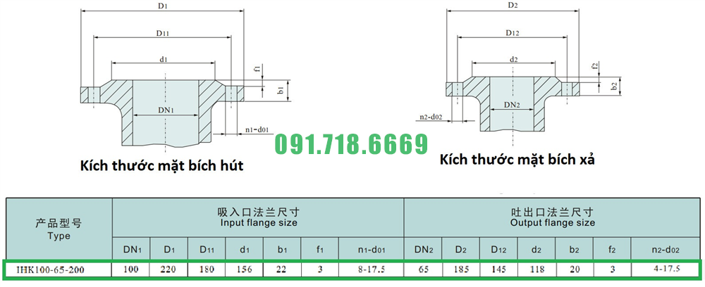 Kích thước mặt bích của máy bơm cánh hở li tâm trục ngang IHK100-65-200 vật liệu inox 316