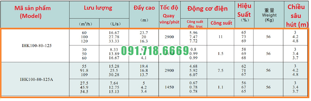 Bảng lưu lượng của máy bơm cánh hở li tâm trục ngang IHK100-80-125 vật liệu inox 316