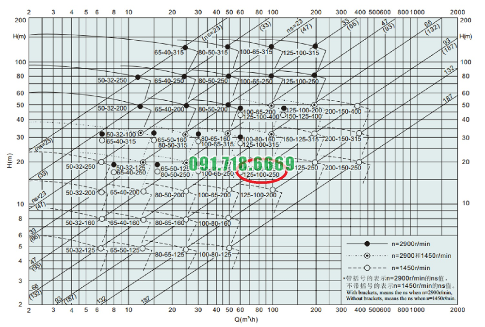 Đường cong hiệu suất của máy bơm cánh hở li tâm trục ngang IHK100-80-125 vật liệu inox 316