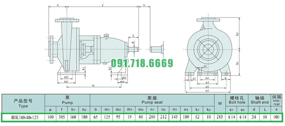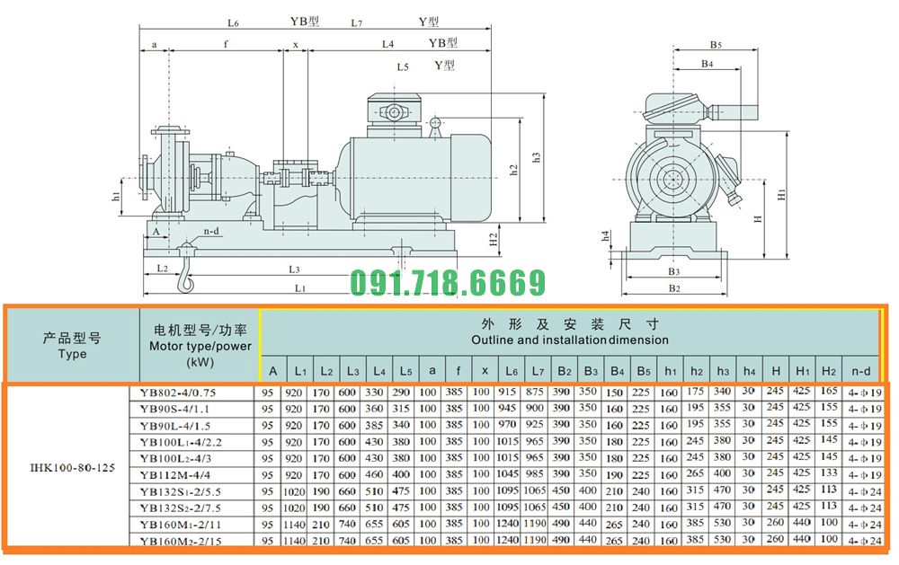 Kích thước của đầu máy bơm cánh hở li tâm trục ngang IHK100-80-125 vật liệu inox 316