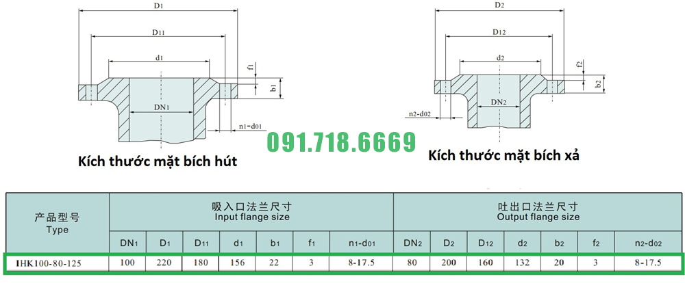 Kích thước mặt bích của máy bơm cánh hở li tâm trục ngang IHK100-80-125 vật liệu inox 316