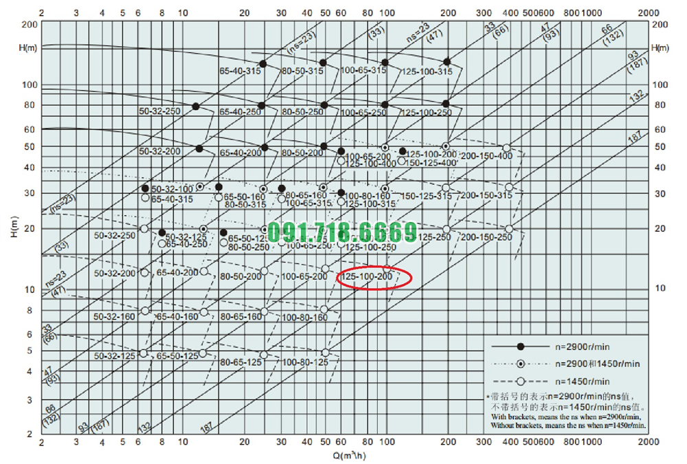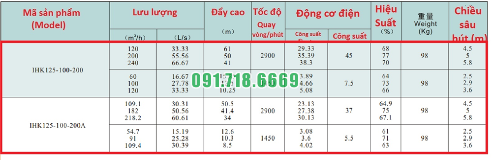 Bảng lưu lượng của máy bơm nước li tâm trục ngang cánh hở IHK125-100-200 có điện áp 380v