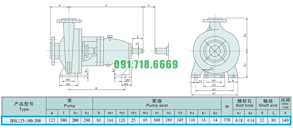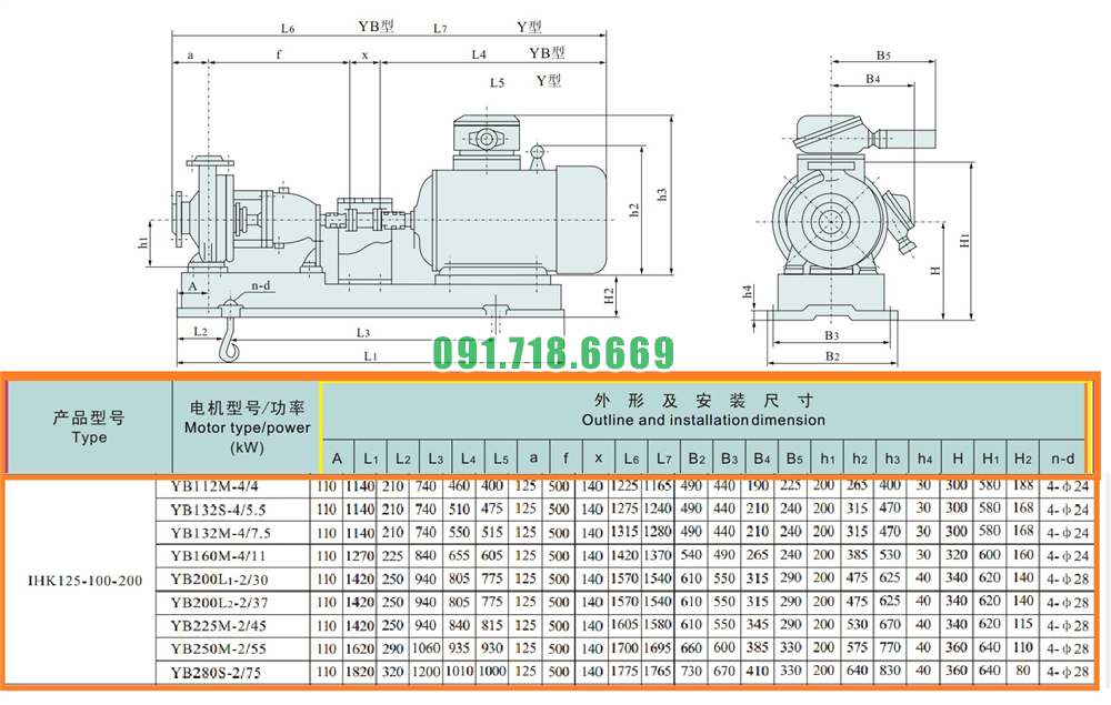 Kích thước của đầu máy bơm nước li tâm trục ngang cánh hở IHK125-100-200 có điện áp 380v
