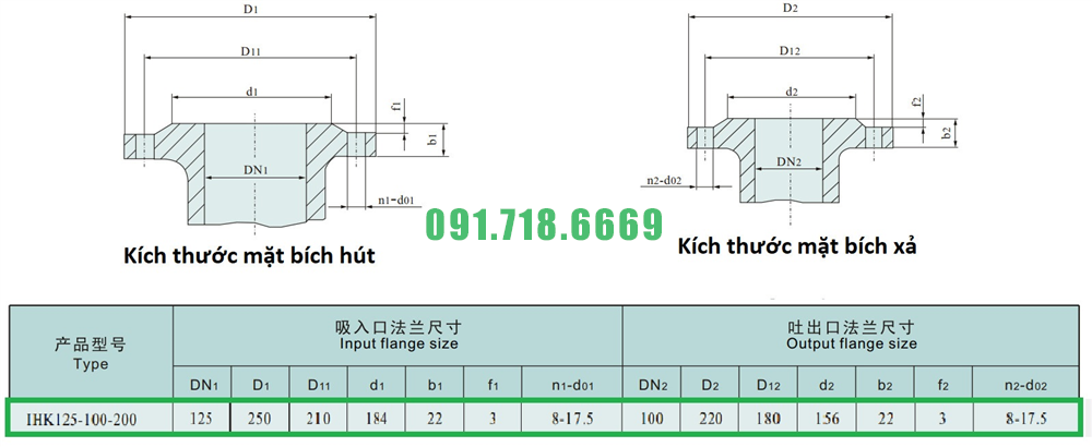 Kích thước mặt bích của máy bơm nước li tâm trục ngang cánh hở IHK125-100-200 có điện áp 380v