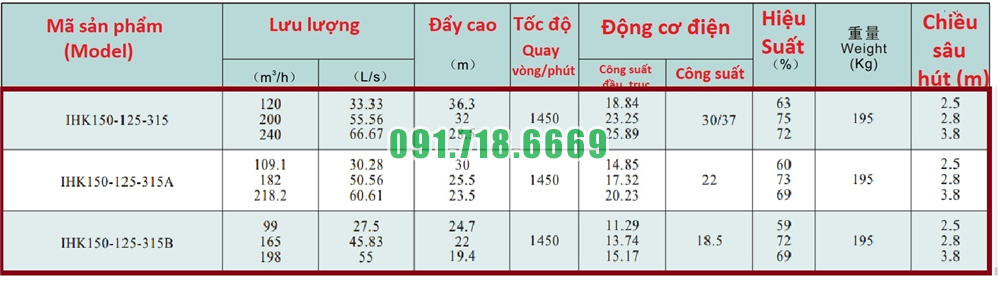 Bảng lưu lượng của máy bơm nước li tâm trục ngang cánh hở IHK150-125-315 có điện áp 380v
