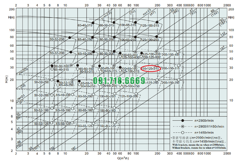 Đường cong hiệu suất của máy bơm nước li tâm trục ngang cánh hở IHK150-125-315 có điện áp 380v