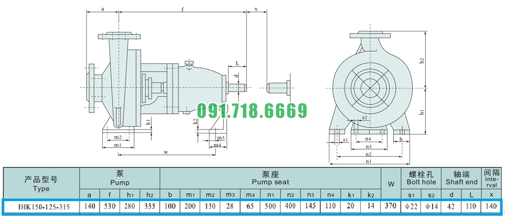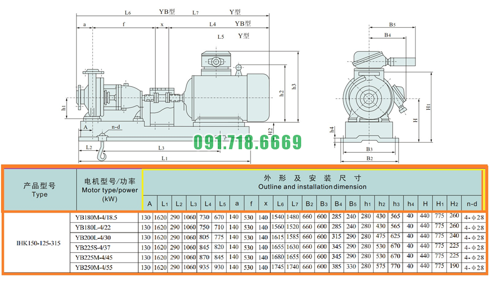 Kích thước của đầu máy bơm nước li tâm trục ngang cánh hở IHK150-125-315 có điện áp 380v