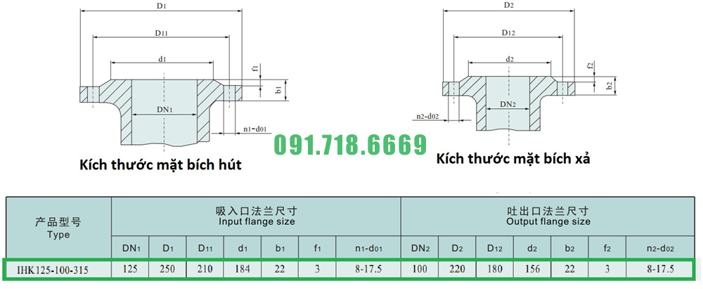 Kích thước mặt bích của máy bơm nước li tâm trục ngang cánh hở IHK150-125-315 có điện áp 380v