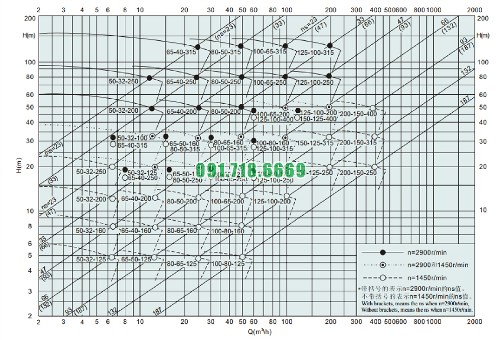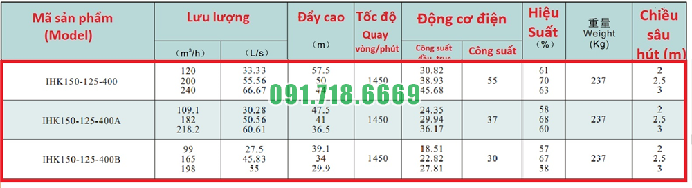 Bảng lưu lượng của máy bơm nước li tâm trục ngang cánh hở IHK150-125-400 động cơ điện 55 kw