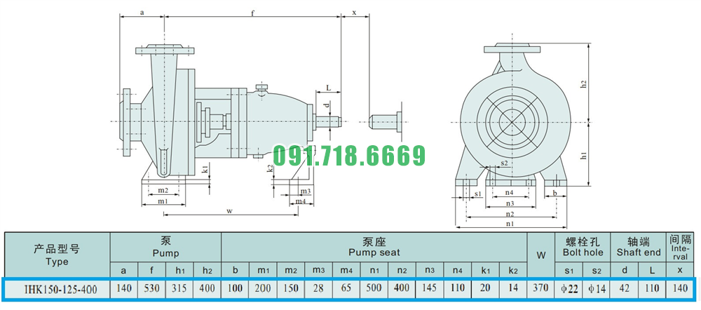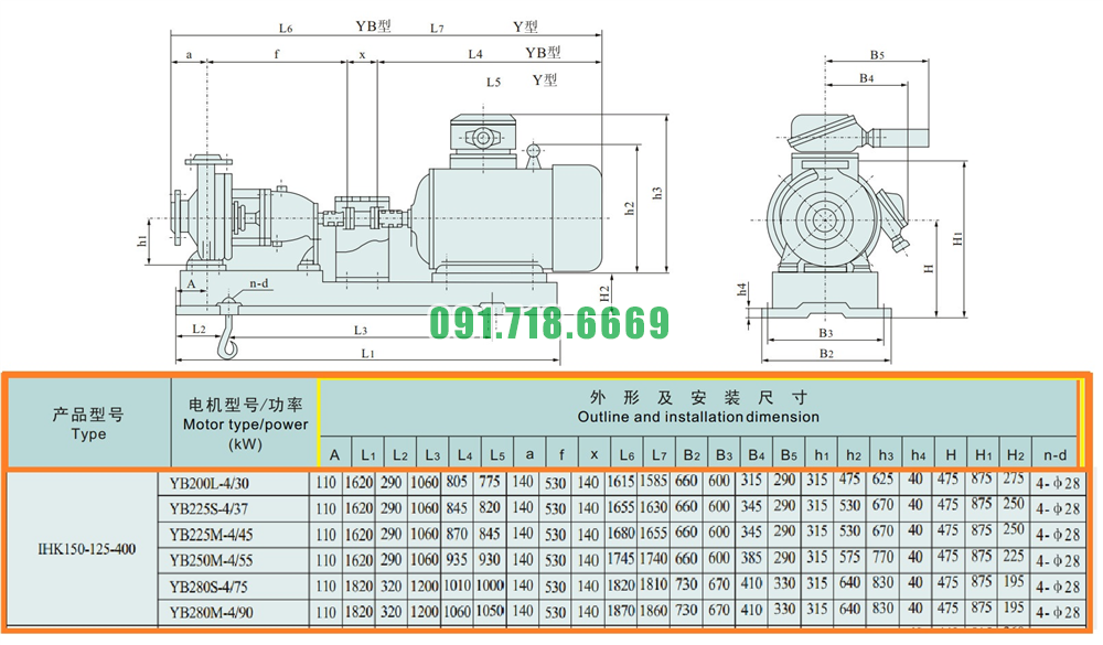 Kích thước của đầu máy bơm nước li tâm trục ngang cánh hở IHK150-125-400 động cơ điện 55 kw