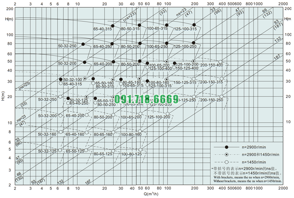 Đường cong hiệu suất làm việc của máy bơm nước li tâm trục ngang cánh hở IHK50-32-125 có điện áp 380v