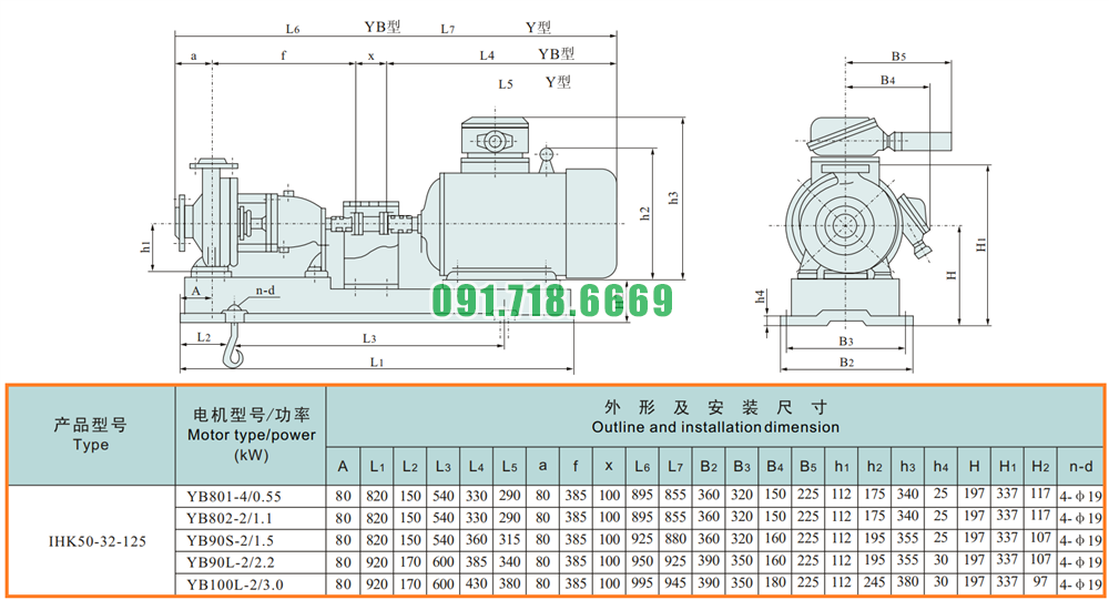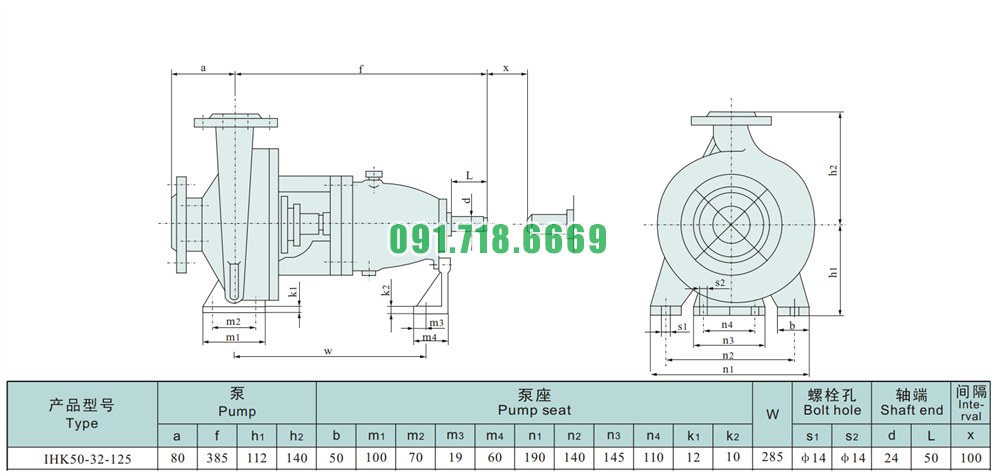 Kích thước lắp đặt của đầu bơm máy bơm nước li tâm trục ngang cánh hở IHK50-32-125 có điện áp 380v