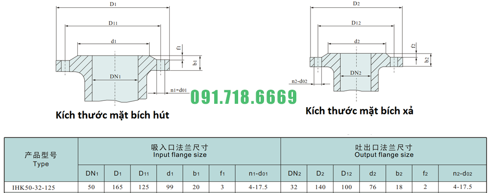 Kích thước mặt bích kết nối hút xả của máy bơm nước li tâm trục ngang cánh hở IHK50-32-125 có điện áp 380v