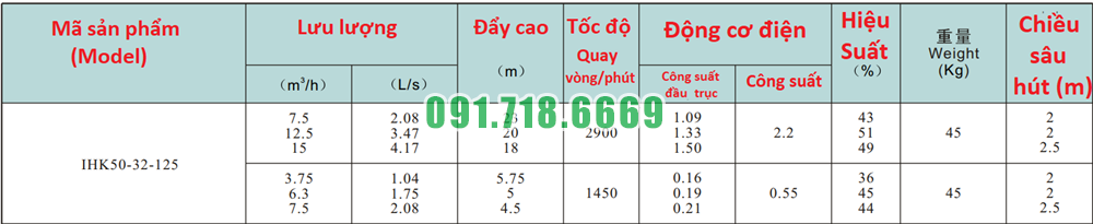 Bảng thông số lưu lượng của máy bơm nước li tâm trục ngang cánh hở IHK50-32-125 có điện áp 380v
