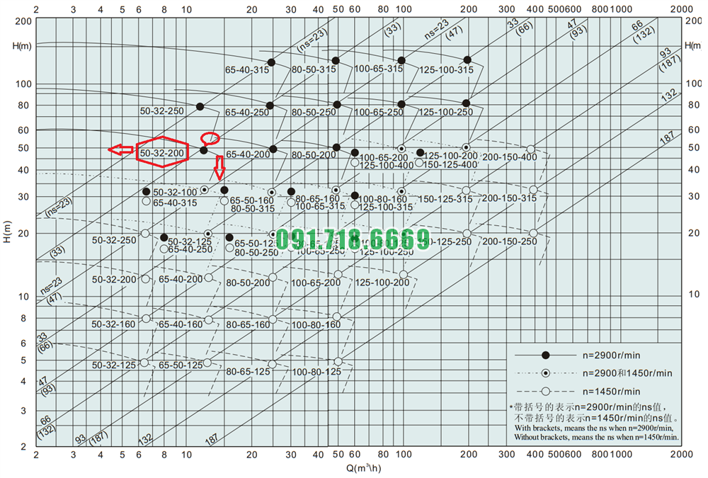 Đường cong hiệu suất của máy bơm nước li tâm trục ngang cánh hở IHK50-32-200 có điện áp 380v
