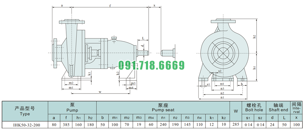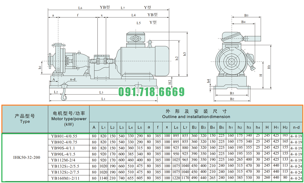 Kích thước của đầu máy bơm nước li tâm trục ngang cánh hở IHK50-32-200 có điện áp 380v