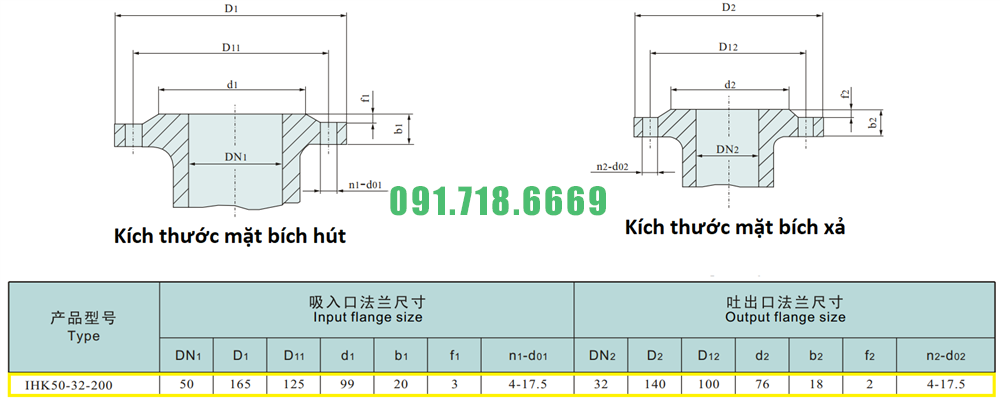 Kích thước mặt bích của máy bơm nước li tâm trục ngang cánh hở IHK50-32-200 có điện áp 380v
