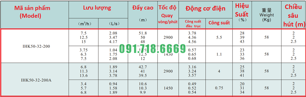 Bảng lưu lượng của máy bơm nước li tâm trục ngang cánh hở IHK50-32-200 có điện áp 380v