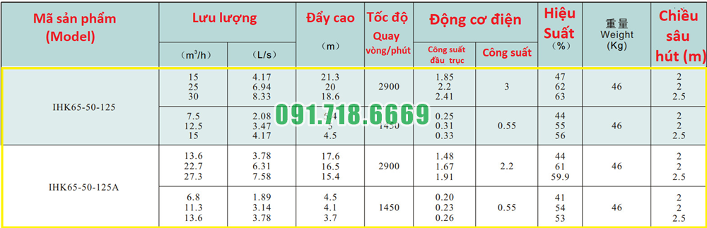 Bảng lưu lượng của máy bơm nước li tâm trục ngang cánh hở IHK65-50-125 có điện áp 380v