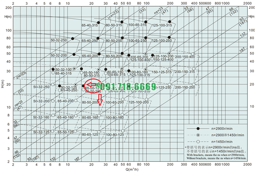 Đường cong hiệu suất của máy bơm nước li tâm trục ngang cánh hở IHK65-50-125 có điện áp 380v
