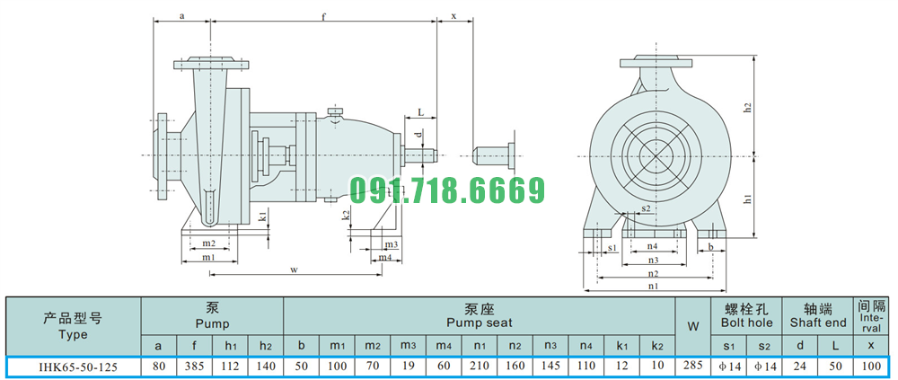 Kích thước của đầu máy bơm nước li tâm trục ngang cánh hở IHK65-50-125 có điện áp 380v