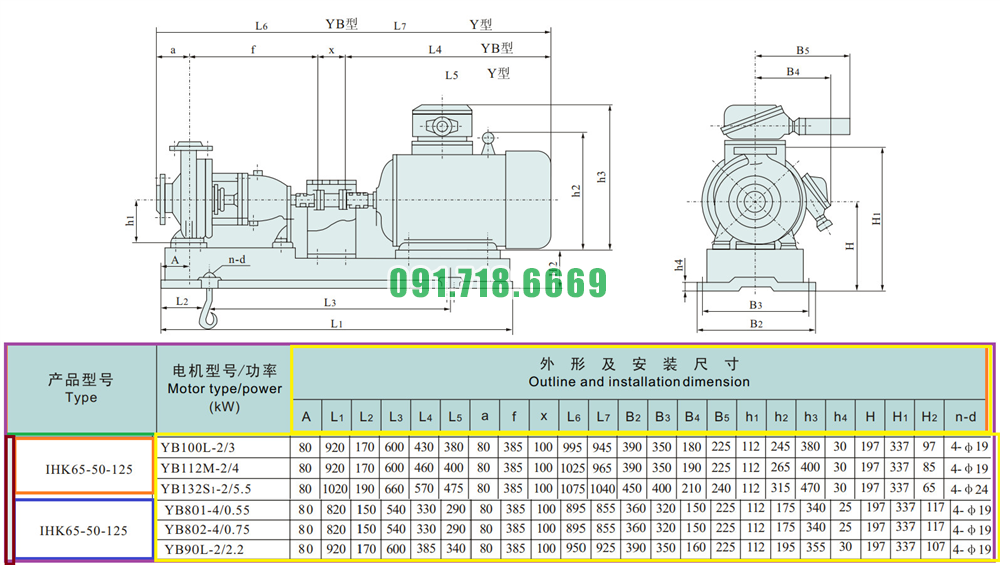 Kích thước lắp đặt của máy bơm nước li tâm trục ngang cánh hở IHK65-50-125 có điện áp 380v