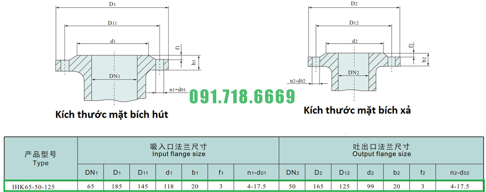 Kích thước mặt bích của máy bơm nước li tâm trục ngang cánh hở IHK65-50-125 có điện áp 380v