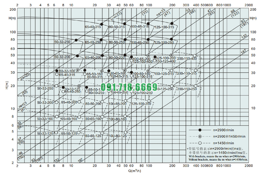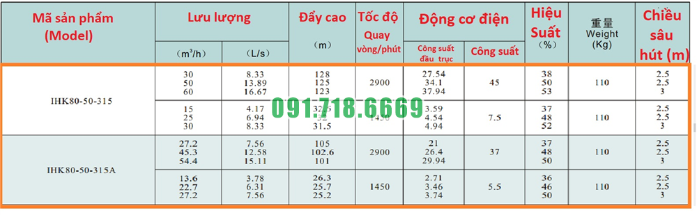 Bảng lưu lượng của máy bơm nước li tâm trục ngang cánh hở IHK80-50-315