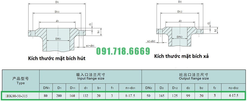 Kích thước mặt bích của máy bơm nước li tâm trục ngang cánh hở IHK80-50-315