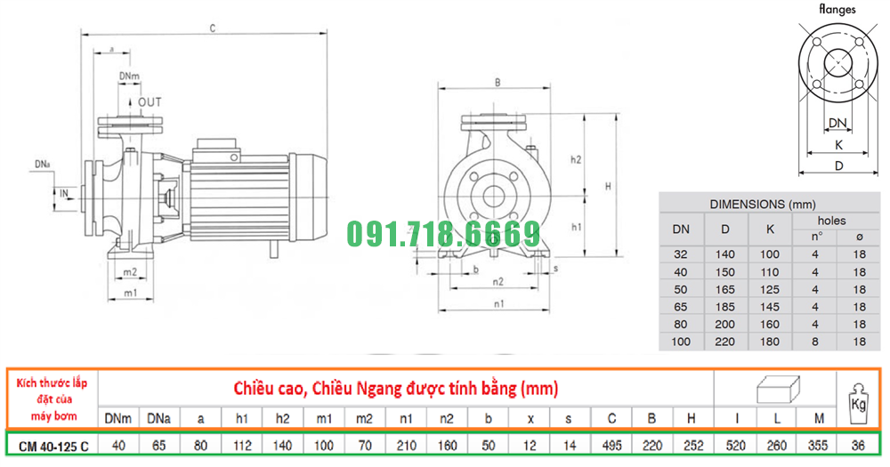 Kích thước máy bơm nước li tâm trục ngang CM32-125A có điện áp 380v