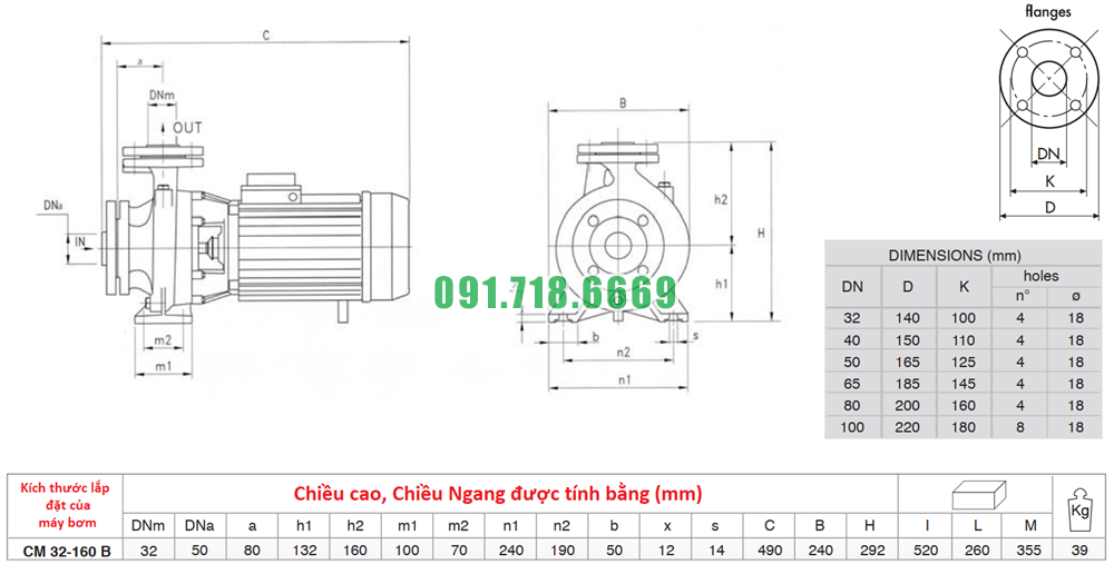Kích thước máy bơm nước li tâm trục ngang CM32-160B có điện áp 380v