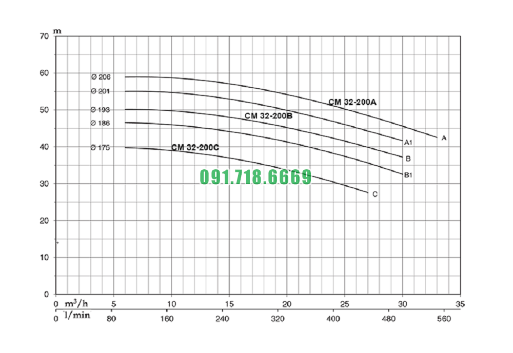Đường cong hiệu suất máy bơm nước li tâm trục ngang CM32-200A có điện áp 380v