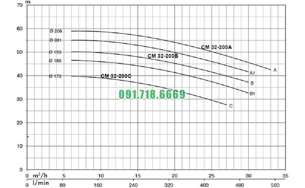 Đường cong lưu lượng máy bơm nước li tâm trục ngang CM32-200B có điện áp 380v