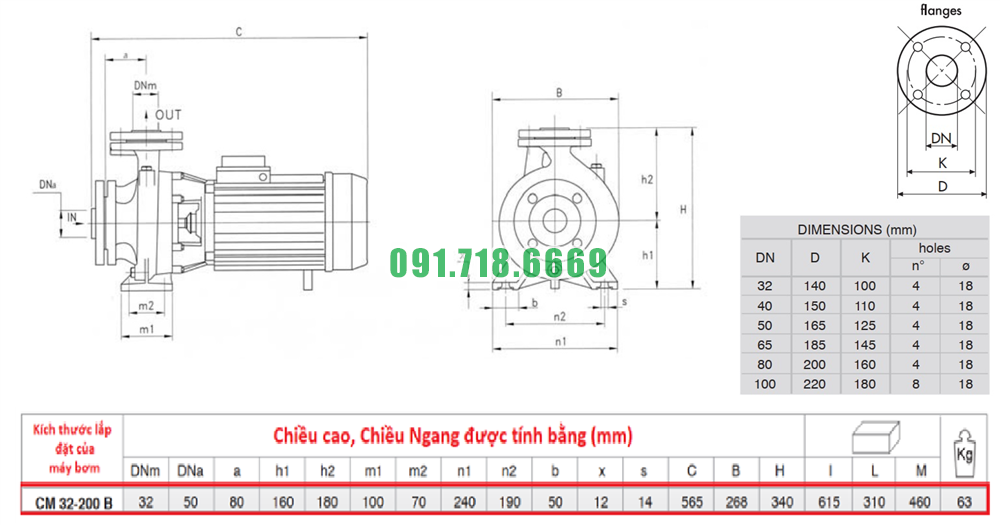 Kích thước máy bơm nước li tâm trục ngang CM32-200B có điện áp 380v