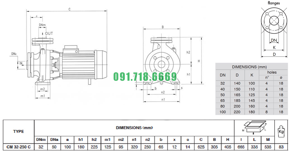 Kích thước máy bơm nước li tâm trục ngang CM32-250C có điện áp 380v