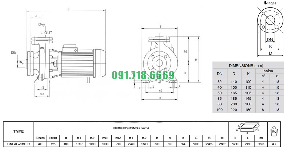 Kích thước máy bơm nước li tâm trục ngang CM40-160B có điện áp 380v