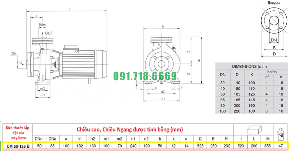 Kích thước máy bơm nước li tâm trục ngang CM50-125B có điện áp 380v