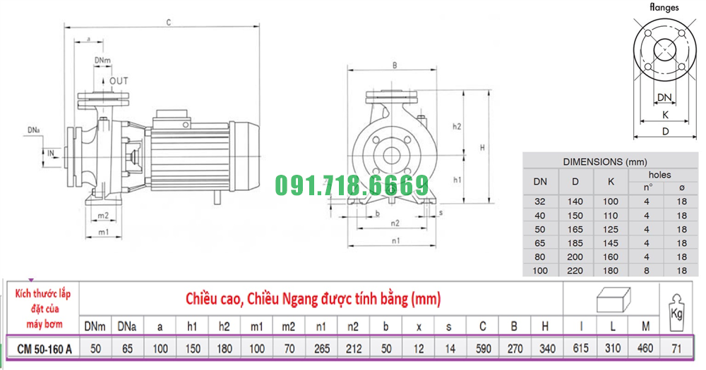 Kích thước máy bơm nước li tâm trục ngang CM50-160A có điện áp 380v