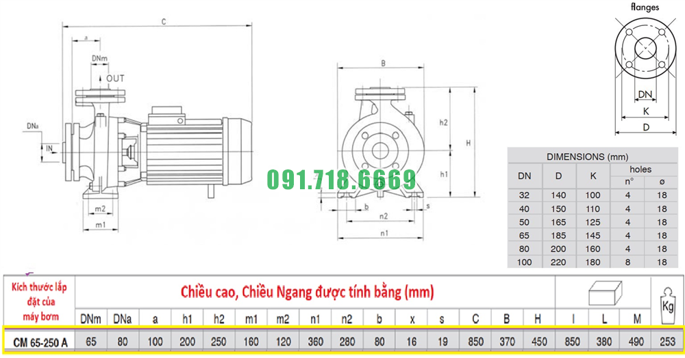 | CM65 - 250A | 180 m3 / h | 90 m | 28.5 kw | 380 v | Dn 80 / 65 mm | Vỏ gang FC200